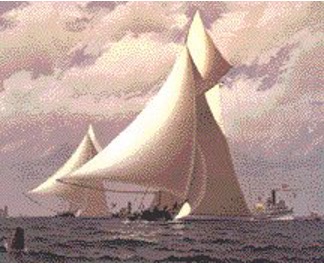 Both Atalanta and Katie Gray were designed by Alex Cuthbert and constructed in our area. In her honour we stage the annual Katie Gray race yearly as a Labour Day classic. It is a fitting tribute to these two boats that we let them them symbolize our 150 year heritage of sailing out of Belleville and the Bay of Quinte. as we crossed Lake Ontario to the Erie Barge Canal heading to New York Harbour, we had a steady unvarnished crew vainly trying to complete construction of the hull enroute. Nailing hull boards as we wound our way down the canal. Atalanta was late for her challenge arriving in September for what was supposed to be a summer series of races.